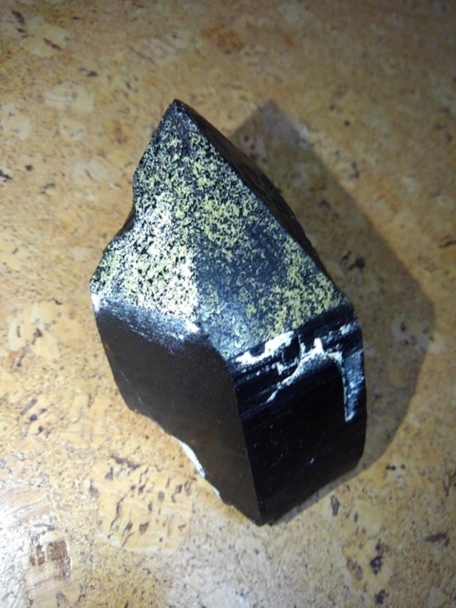 モリオンの原石です。 ポイントの横や底が割れたようになっていますが、セルフヒールドになっています。 セルフヒールドとは地中で水晶が何らかの理由で折れたあとに、その折れたところが再結晶したものです。 セルフヒールドは自己再生、修復を意味しています。 表面の一部に緑色の別の鉱物が確認できます。 ひとつの水晶から様々な顔をみることの出来るパワーストーンです。 セルフヒールドの部分からはやさしいエネルギーを感じることが出来ます。 全体的に強いエネルギーを感じますが、付着している鉱物や部位によって様々なエネルギーを感じることが出来ます。 モリオンは強力な浄化や邪気払い、魔除け、グラウディング等非常に強い効果を持ち合わせていますが、この石は少しやさしめの石ですので持ちやすいモリオンをお求めの方にオススメです。 縦幅×横幅×厚み 約86㎜×約53㎜×約43㎜ 重さ 192グラム 天然石ですので天然の傷や欠けがある場合があります。ご了承ください。
