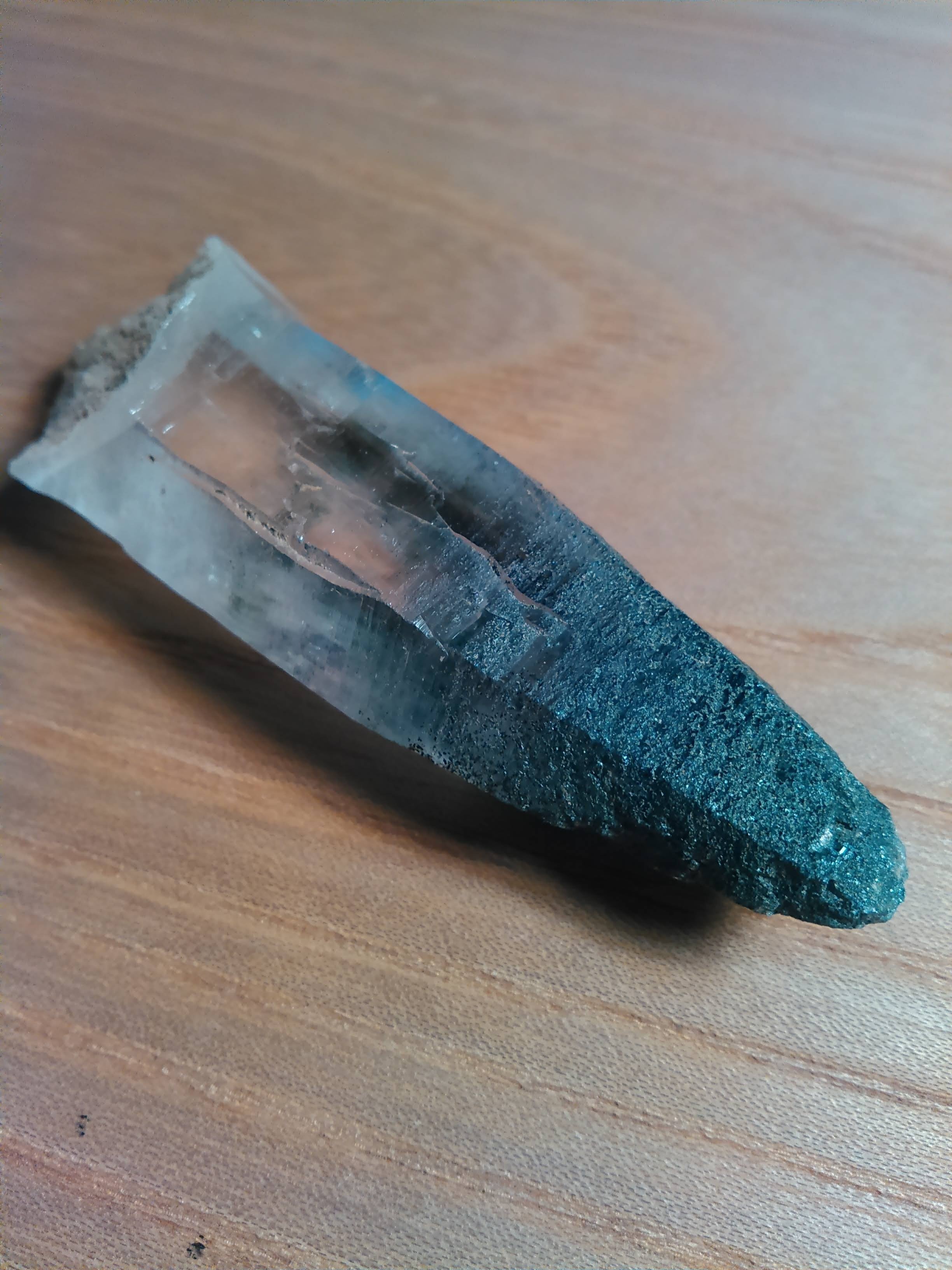 水晶の先にクローライト(緑泥石)がたくさんついています。水晶は透明度が高いです。